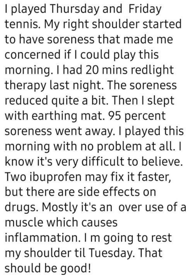 ● “I have suffered from Achilles tendonitis in my right foot for many months and was starting to get it in my left foot. The pain when I got out of bed was excruciating, a 9 on a pain level of 1-10. After 4 weeks of grounding (with a half-sheet and mat) the pain level is about 4-5 now and the pain in my left foot has gone. My husband suffers from pain in his shoulders, hips, and back which we believe is osteoarthritis. The shoulder and hip pain is mostly gone and the back pain has reduced by 30%.”